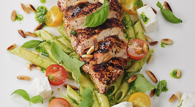يصب المزيج في صحن التقديم ويوضع على الوجه الدجاج المشوي وجبن الفيتا ويزين بالصنوبر على الوجه.