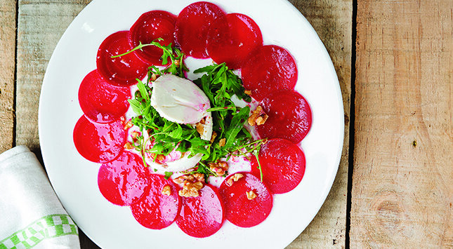 سلطة‭ ‬الشمندر‭ ‬مع‭ ‬جبن‭ ‬الموتزاريلا‭ ‬الجاموسي‭ ‬والجرجير‭ ‬البري‭ ‬