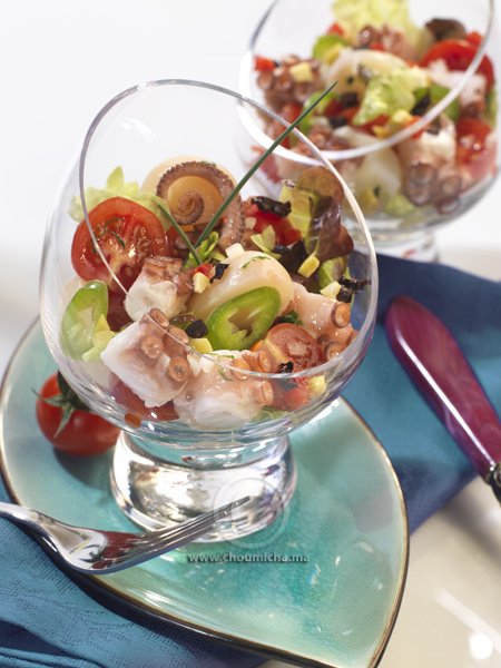 - تضاف كل الخضر المقطعة إلى الاخطبوط المنقوع في التوابل. تخلط كل المكونات برفق حتى تندمج عناصر السلطة. تقدم السلطة فوق طبقة من أوراق الخس.