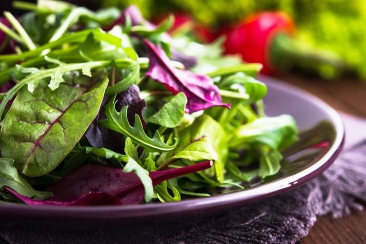 1. اخلطي الخس الملون والخس العادي مع الريحان والجرجير في وعاء.