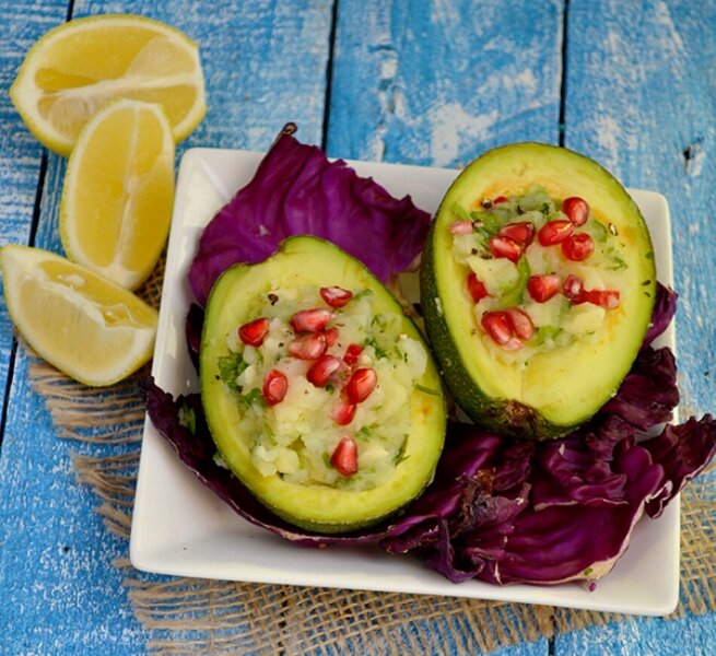 4. يتم حشو قشرة الأفوكادو بالسلطة ويزين بحبيبات الرمان ويقدم كطبق بارد.