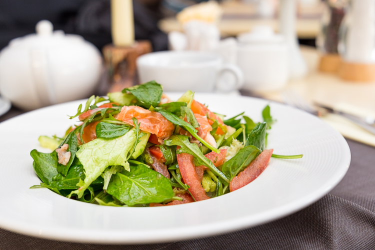 - نقطع السلمون المدخن شرائح رفيعة طولية ونضيفها إلى الوعاء مع الجرجير والكزبرة.