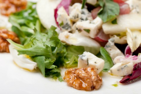 - ونقوم بفرد جوانح البصل فوق الخس مع جوانح الإجاص ثم نغطي وجهها بملعقتي طعام من الجبنة الزرقاء (بلو تشيز) ثم جوز و رشة من حبوب الرمان.