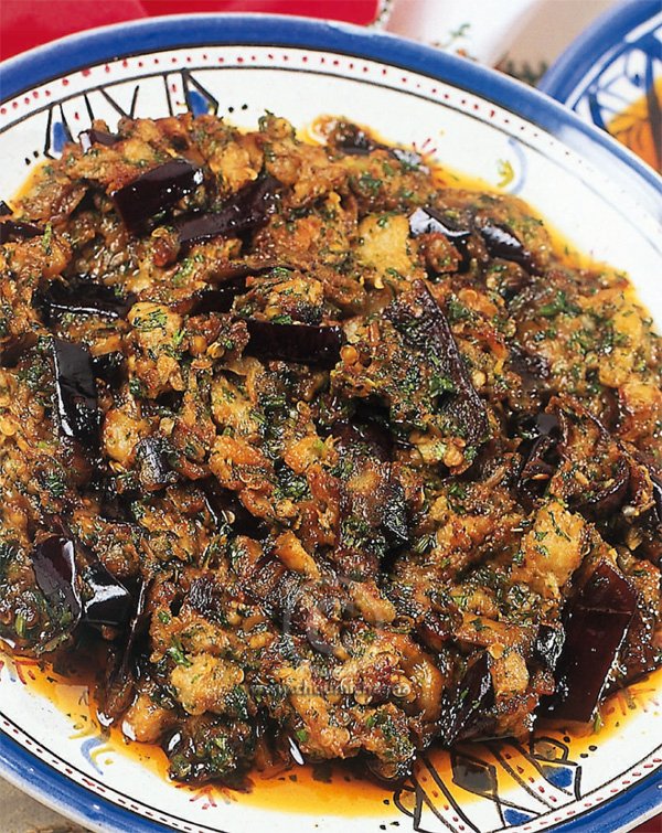 - تطهى دوائر البادنجان في الزيت الساخن، تمعك بشوكة ثم تصفى من فائض الزيت. توضع عجينة الباذنجان المصفاة في مقلاة، يضاف إليها الثوم، الكمون، الفلفل الأحمر، الخل، الملح والبقدونس.