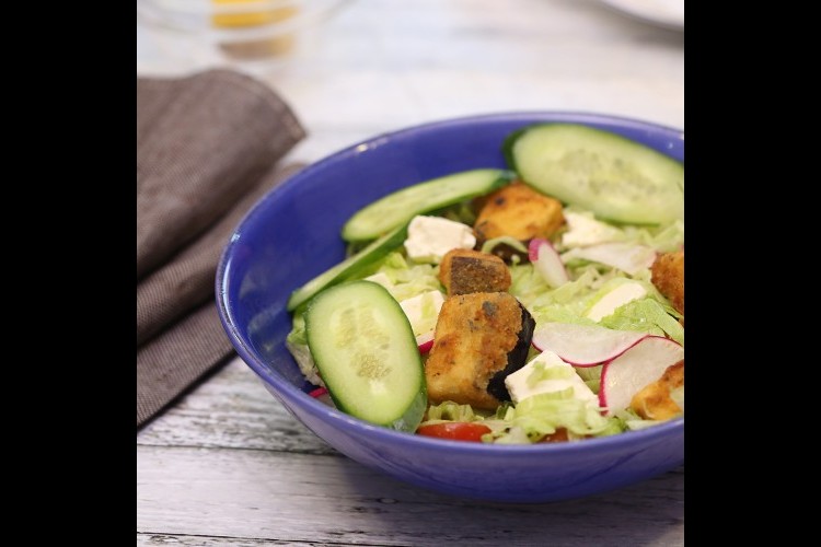 4. في وعاء كبير تخلط جميع مكونات السلطة ثم تضاف لها مكعبات الباذنجان المقلية ومكعبات الجبن وتقدم مع عصير الليمون والقليل من زيت الزيتون.