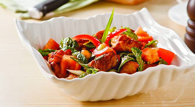 تمزج بقية المكونات، ثم تخلط مقادير الصلصة وتدار فوق المزيج وتقدم.