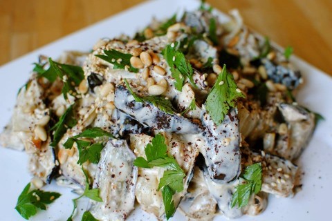 - تخلط الطحينة بالماء ثم يُضاف إليها عصير الليمون والملح و الثوم والبقدونس و يُصب الخليط على الباذنجان و يُخلط معهما جيداً