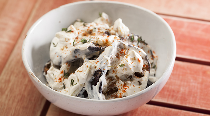 يصب لبن الزبادي في وعاء كبير، يضاف عصير الليمون الأخضر والزنجبيل والثوم المهروس و5-8 أوراق زعتر وزيت زيتون مع التخليط ويتبل بالكمون المطحون والملح والفلفل.