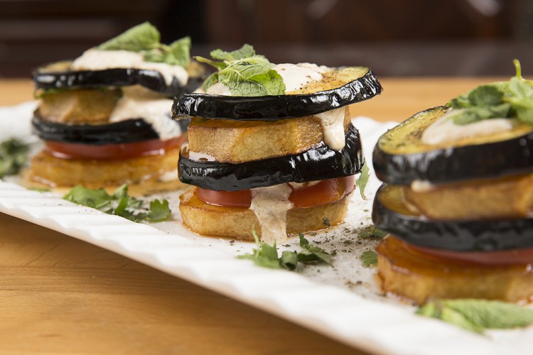 6. في صحن التقديم: ضعي شريحة باذنجان ثم فوقها بطاطس ثم شريحة طماطم وفوقهم صوص طحينة.