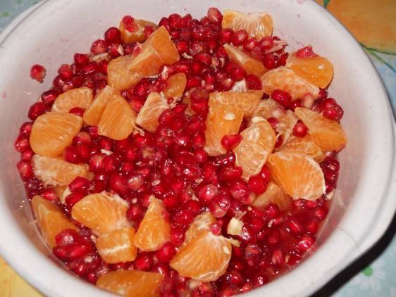 ٢. تقشر الرمانة مع الحرص على تنقية حبوب الرمان من الاوراق الصفراء ثم توضع فوق شرائح البرتقال.