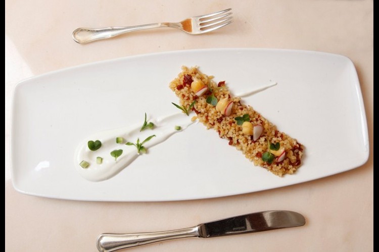 4. للتقديم: في طبق التقديم، يسكب البرغل الممزوج مع الملح والبهار الأبيض والبهار الأسود، ويوضع فوقه الحمّص المسلوق. يزّين باللبن الزبادي والخيار المفروم وقطع الطماطم المجفّفة، ويقدّم بارداً.