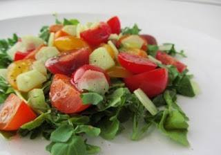 - يوضع الجرجير المقطع وشرائح الطماطم والبروكلي في طبق.