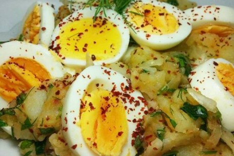 - تسكب البطاطس بصحن..وتزين برشة فلفل احمر ونقطع البيض انصاف..ونزين به طبق البطاطس