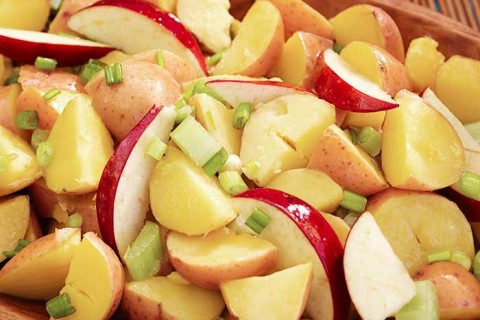- نقطع التفاح مكعبات ونضيفه للبطاطس، ثم نضيف شرائح الخيار المخلل والبقدونس.