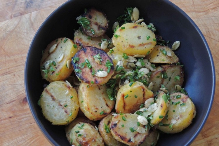 2. ضعي البطاطس مع القليل من الزيت واشويها على الجريل حتى تنضج.