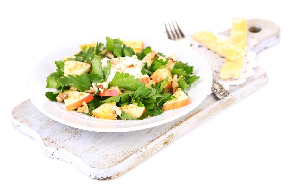 - قطعى التفاح الأخضر رفيع و أضيفى عصير الليمون أخلطى التفاح الأحمر مع الأخضر مع البرغل .