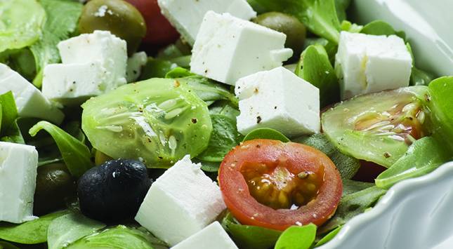 يُخلط الخيار والطماطم والبقلة وجبن الفيتا معًا في وعاء.