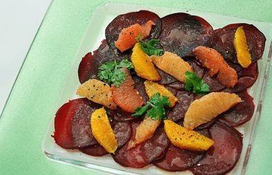 - في طبق التقديم، تُرص حلقات البنجر وفصوص الجريب فروت والبرتقال، وتُزين بأوراق الكزبرة الخضراء