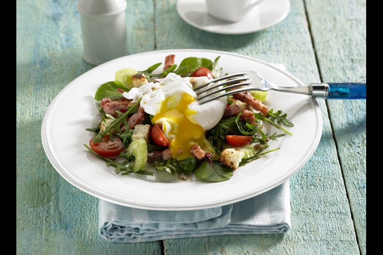 5. طريقة التقديم: يوزّع السلق والجرجير بالتساوي على طبقين، وكذا اللحم والخبز والبندورة والبقدونس، ثمّ تُنقل البيضة الـ”بوشيه” على سطح كلّ طبق، وتُصبّ الصلصة، ويُنثر الملح والفلفل.