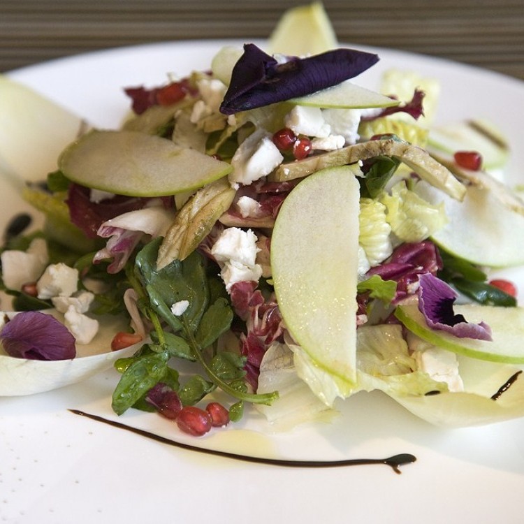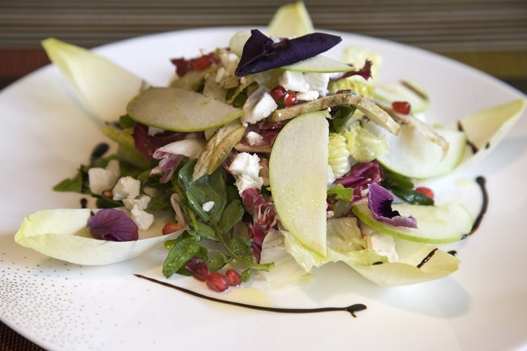 4- توضع 5 أوراق من الورود الصالحة للأكل على أطراف طبق التقديم، والسلطة في منتصفه، ثم يضاف الخرشوف وجبن الماعز، ويقطع التفاح إلى شرائح رفيعة تضاف فوقها ويوزع الرمّان.