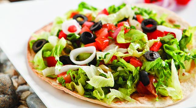 يُخلط عصير الليمون مع الفلفل الرومي والخس والزيتون، ثم يُقسم الخليط بين التورتيا المحمصة، ويوضع خليط الطماطم على الوجه.