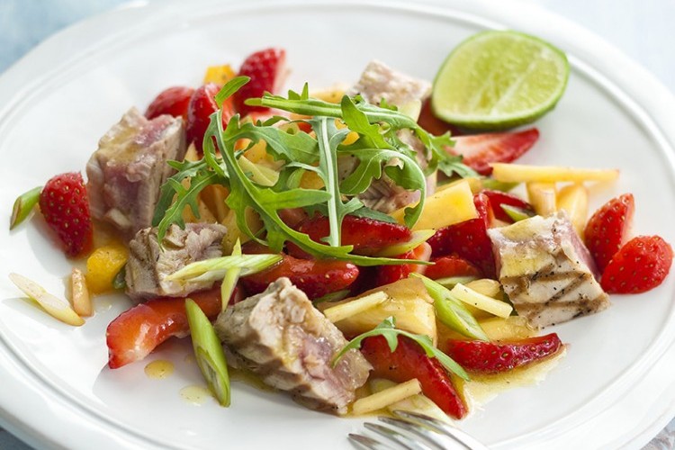 2. تُصبّ ملعقة الزيت الباقية على لحم التونا، قبل شيّه لحوالي دقيقة أو دقيقتين على الشوّاية الساخنة. ثمّ، يُدع اللحم المشوي جانبًا لبضع دقائق، قبل تقطيعه إلى شرائح. وتوزّع الشرائح المذكورة على خليط الفاكهة، الذي يُوزّع على طبقين، وفوقهما أوراق الطرخون، وما تبقّى من سائل التتبيلة. وتُقدّم السلطة، مع شرائح الليمون الحامض.