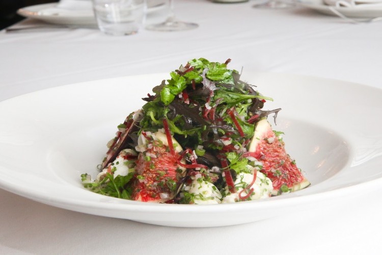 2. للسلطة: تُقطَّع حبَّات التين إلى أرباع. يُقطَّع اللحم بدوره، إلى شرائح رفيعة. يُضاف المكوِّنان إلى وعاء كبير خاص بالسلطة، مع الأوراق الخضراء المُشكَّلة، والهندباء. يُفتَّت جبن الماعز، فيُضاف إلى وعاء السلطة.