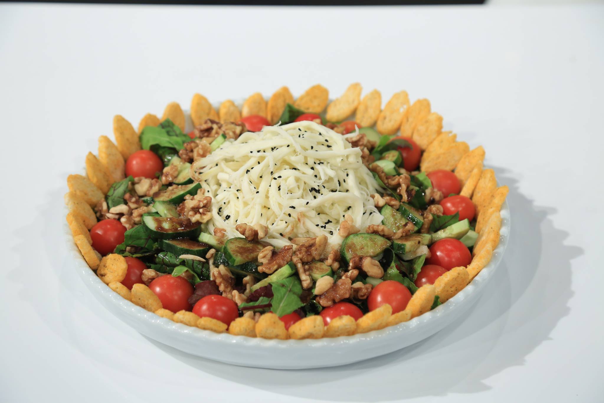رتبي جميع مقادير السلطة بشكل متناسق (جوز او بيكان ,خيار, بندورة ,خضار ورقية جبنة مجدلة ,خبز محمص,حبة البركة )