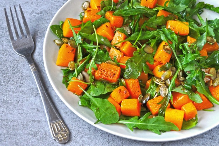 - ضعي الجرجير في طبق وأضيفي القرع المشوي وبذور القرع المحمصة وعصير الليمون.