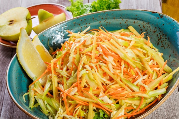 - اخلطي الملفوف والجزر والتفاح في طبق.
