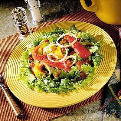 - وترتب المقادير السابقة كل واحدة منفصلة عن الأخرى في طبق واحد، ثم يخلط كلاً من المايونيز، والليمون، والملح، والفلفل الأسود، ويسكب الخليط على طبق السلطة ويقدم .