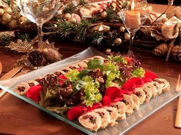 4. يقطّع “رولو” الدجاج إلى شرائح متساوية، ويوضع في طبق التقديم الذي نزيّنه بأوراق الخس الأجنبي الأحمر والأخضر، وحبّات البندورة الكرزية.