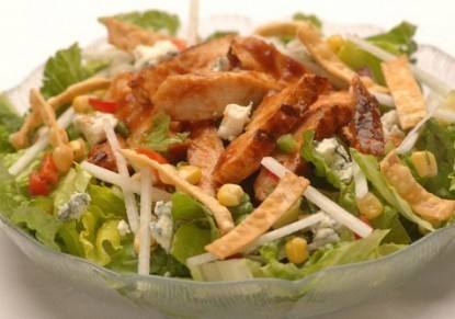 - تصف أوراق السلطة الخضراء في أطباق التقديم وتسكب فوقها سلطة الدجاج، تزين الأطباق بالبصل الأخضر.