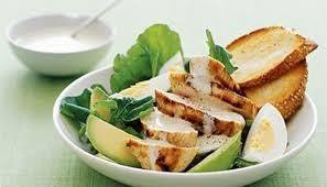 - ترص السلطة في طبق التقديم وتوضع قطع الدجاج وتقطع أما مكعبات أو شرائح.