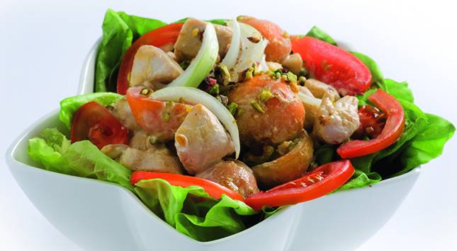 يضاف إلى الدجاج ½ كوب من الفستق مع المشمش المقطع والمايونيز والكريمة الحامضة والخردل والعسل والسكر البني والفجل الحار وصلصة الشطة والملح والفلفل الأبيض.