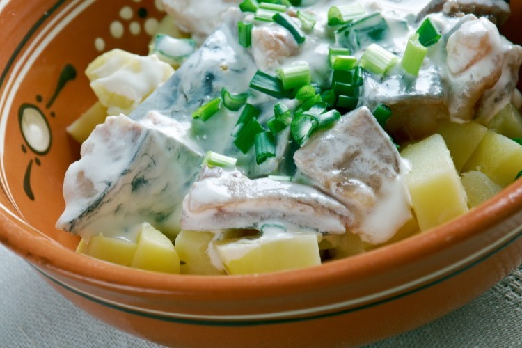 - يتم إضافة التتبيلة إلى لحم سمك الرنجة ورش السلطة بالزيت والشبت والبقدونس.