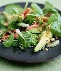 - يقشر الأفوكادو ويقطع إلى قطع ثم يغسل بعصير الليمون لتفادي اسوداده، توزع قطع الأفوكادو على الخس والسبانخ.