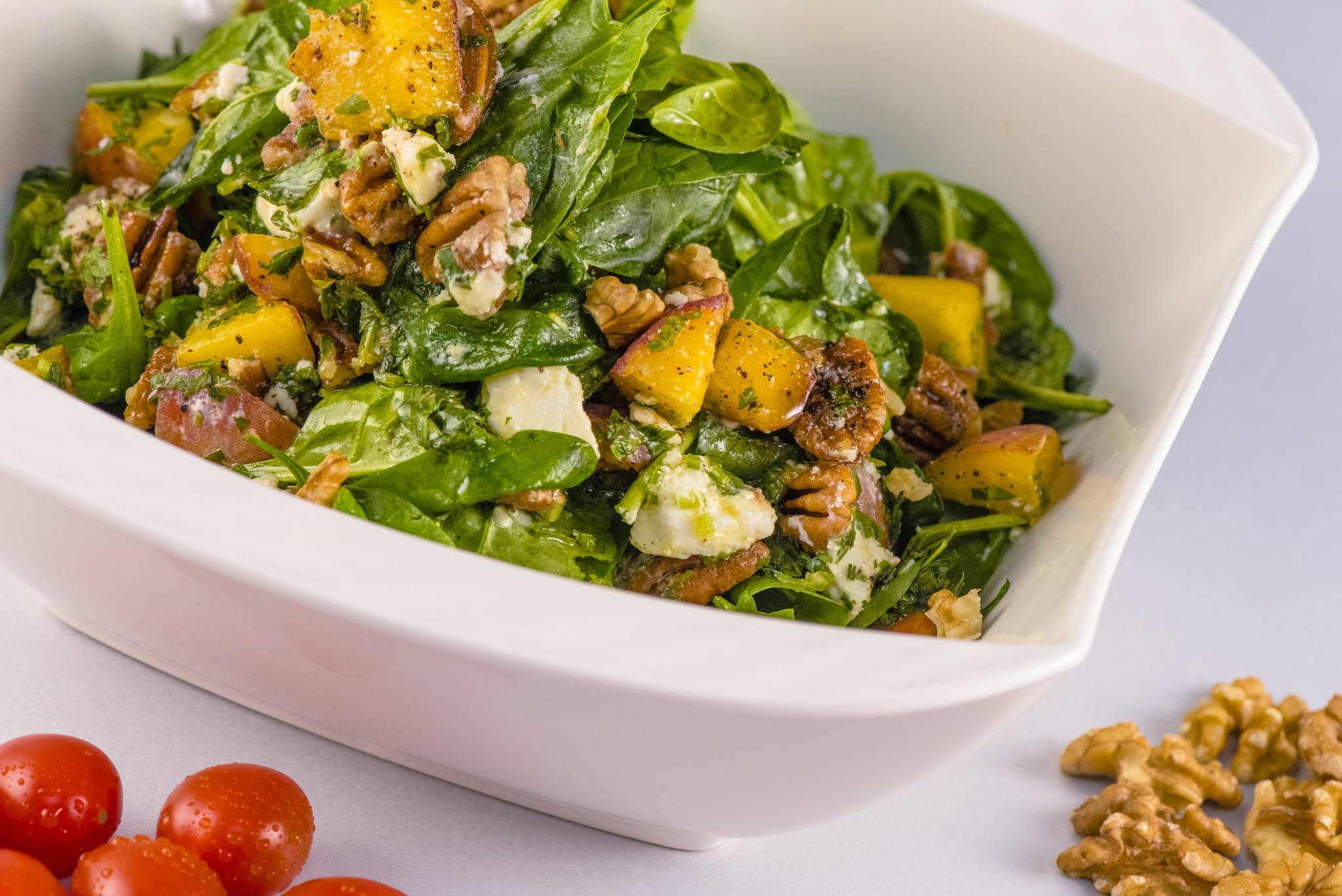 يقلب السبانخ مع الجوز المحمص والبصل الاخضر.