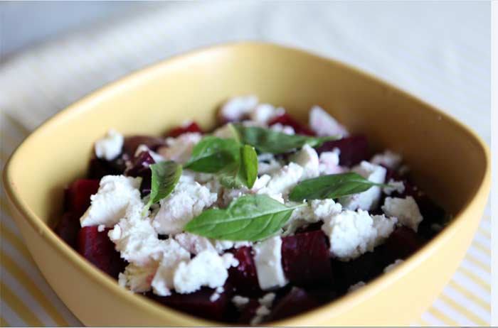 4. اخلطي مكعبات الشمندر مع الجبنة الفيتا وأوراق الريحان في وعاء.