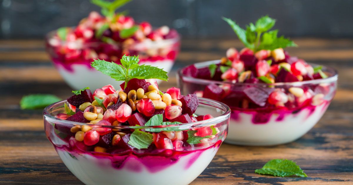 5- وزعي مزيج اللبن في أطباق التقديم ثم زيدي على وجه قطع الشمندر.