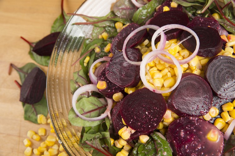 5. ضعي بعض أوراق الخس أو الجرجير في طبق تقديم، ضعي شرائح الشمندر، شرائح البصل ثم انثري الذرة وقدميها باردة.