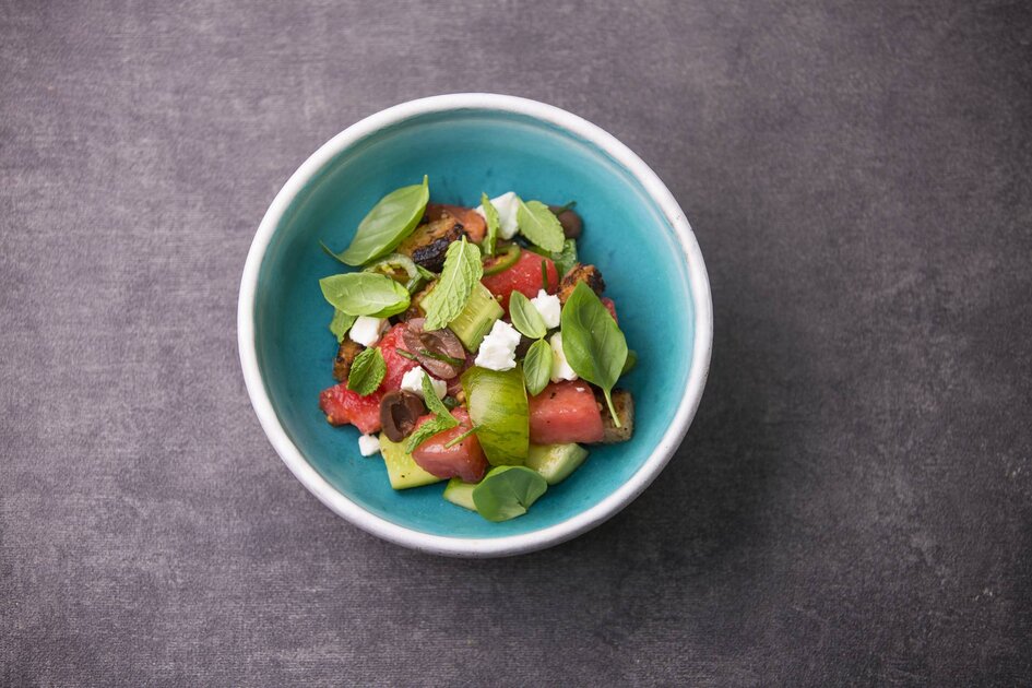 في وعاء، يجمع الخبز والطماطم والخيار والبطيخ والهالبينو وزيتون الكالماتا والأعشاب والبصل المعمر