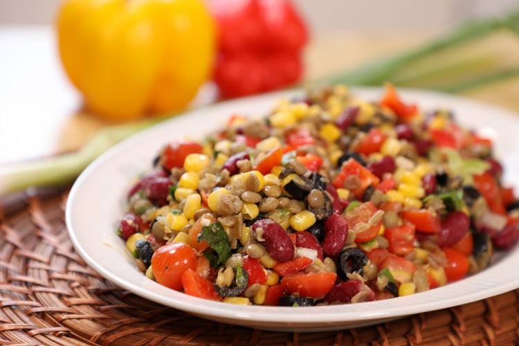 1. ضعي العدس في قاع طبق التقديم، وأضيفي الذرة والزيتون الأسود المقطع، والطماطم، والفليفلة الحمراء، والفاصولياء الحمراء.