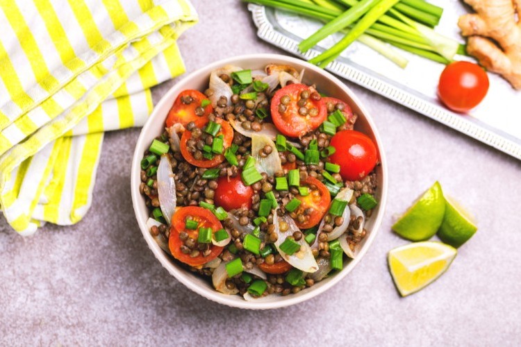 - اخلطي العدس المسلوق مع البصل الشرائح والطماطم الكرزية في طبق.