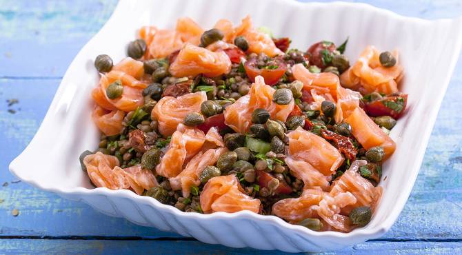 يرش السلمون بعصير الليمون وزيت الزيتون.