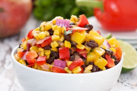 - فى وعاء عميق نضع الفاصوليا والذرة ومكعبات الطماطم والهالبينو ونقلب.