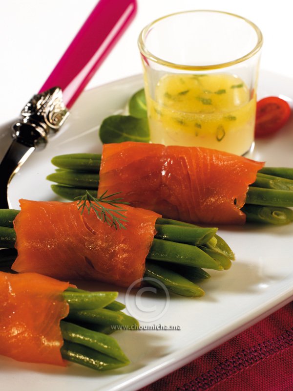 • تقدم حزم الفاصوليا الخضراء بسمك السلمون المدخن مزينة بالثوم القصبي.