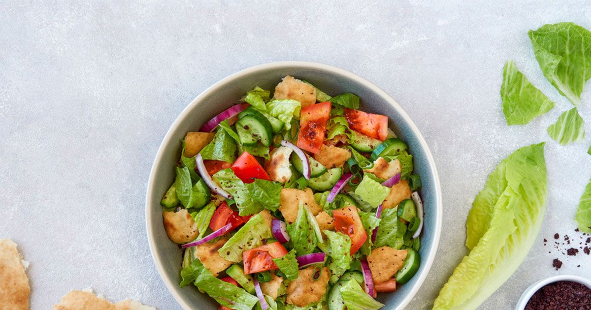 1- في طبق التقديم، ضعي الخيار، الطماطم، البصل، الخس، النعناع، البقدونس، الفلفل الرومي والفجل.
