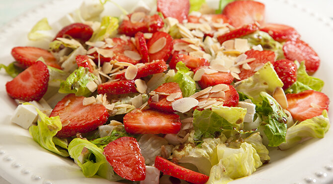 في وعاء كبير، يقلب اللوز المحمص والخس الروماني والفراولة وجبنة الفيتا معاً.