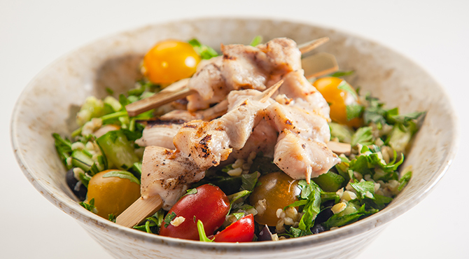 تشوى أسياخ الدجاج حتى تصبح ذهبية وتنضج كلياً.